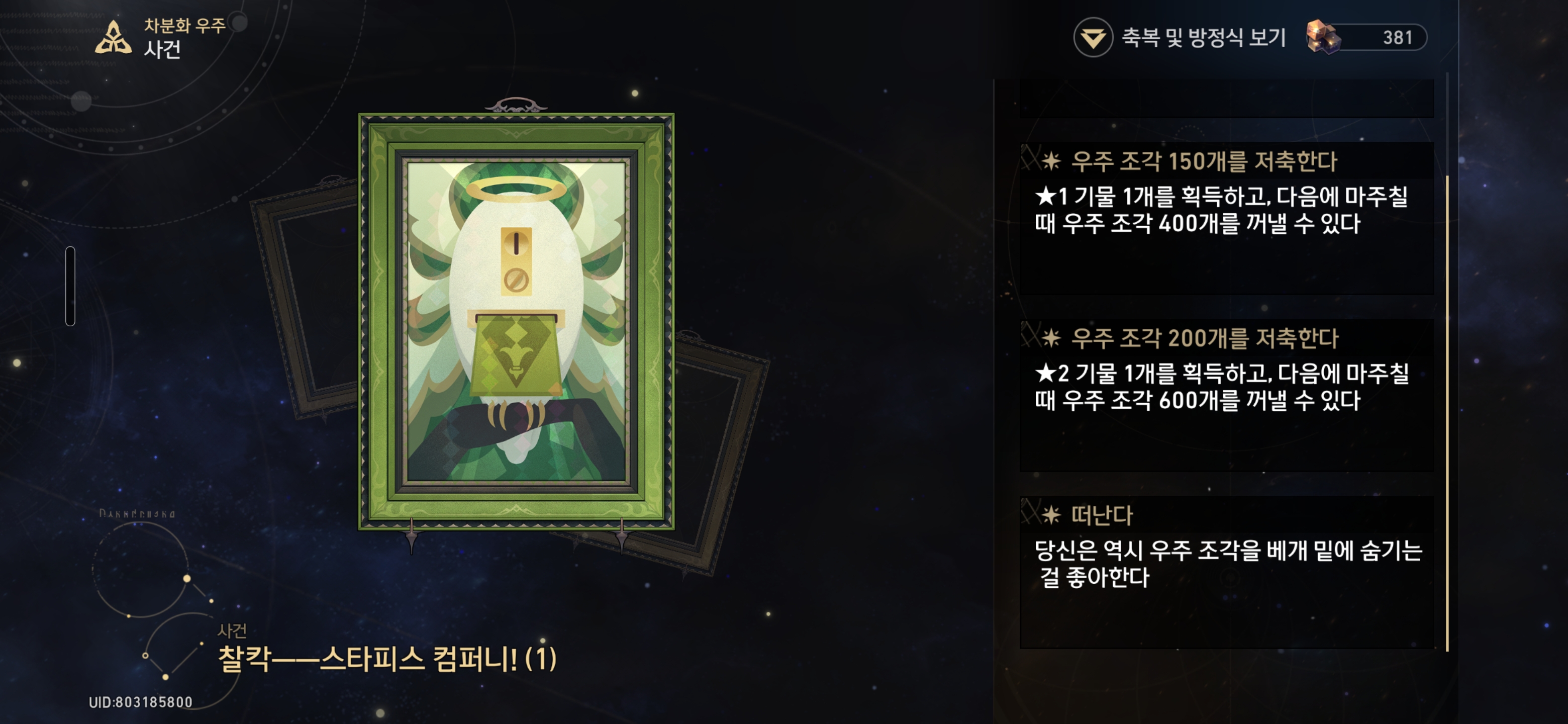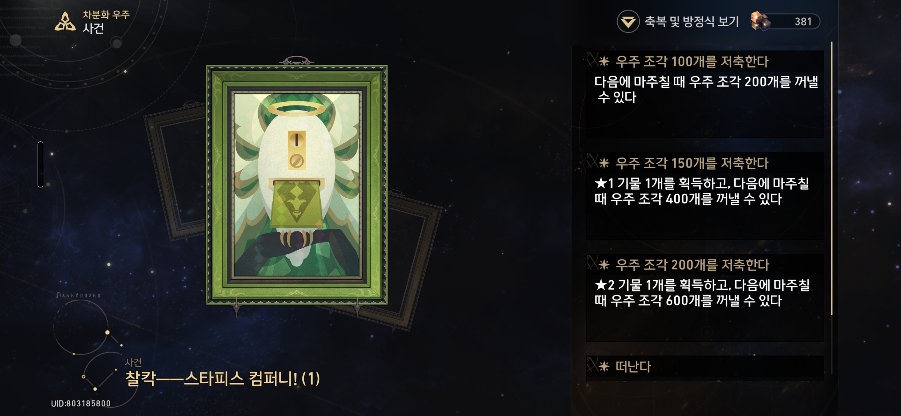 우주 조각 150개를 저축한다 - ★1 기물 1개를 획득하고, 다음에 마주칠 때 우주 조각 400개를 꺼낼 수 있다