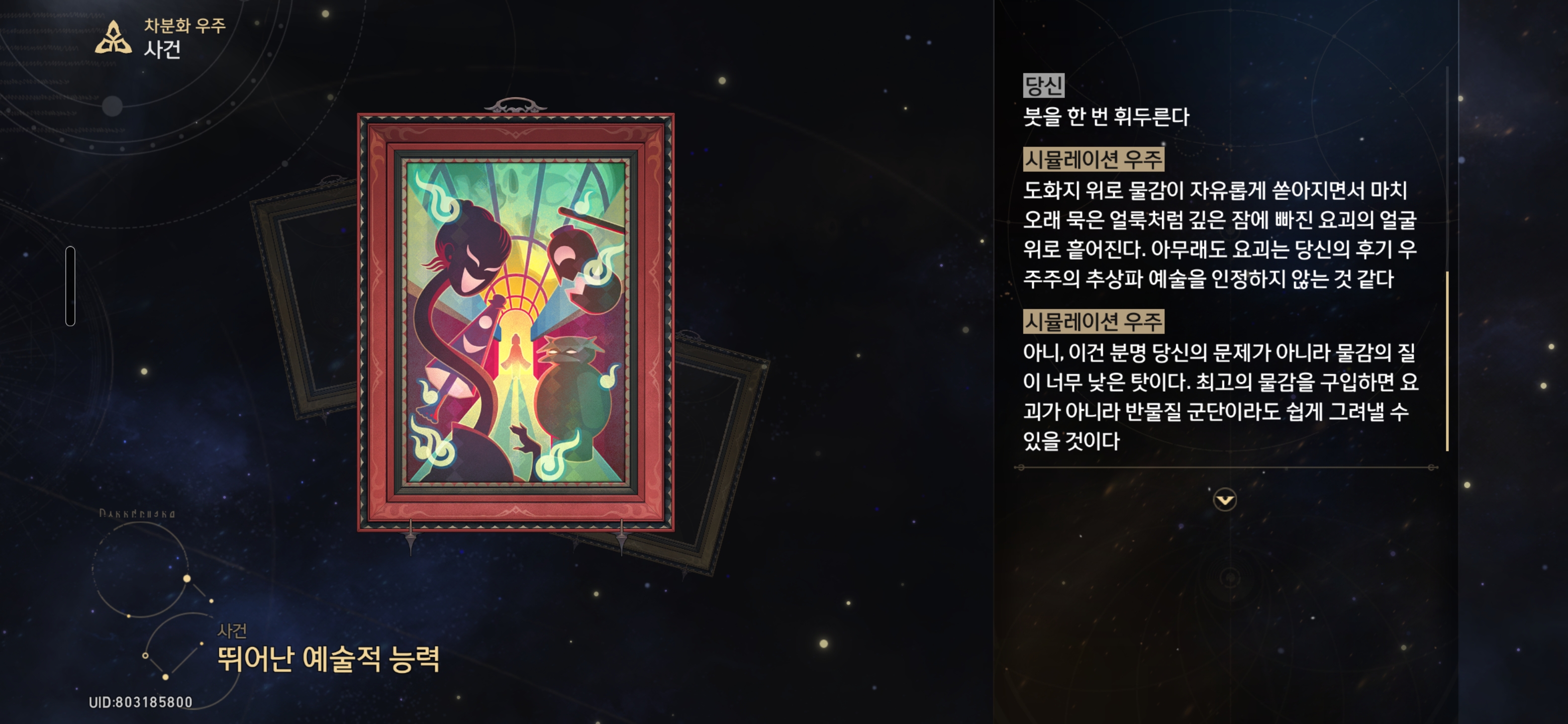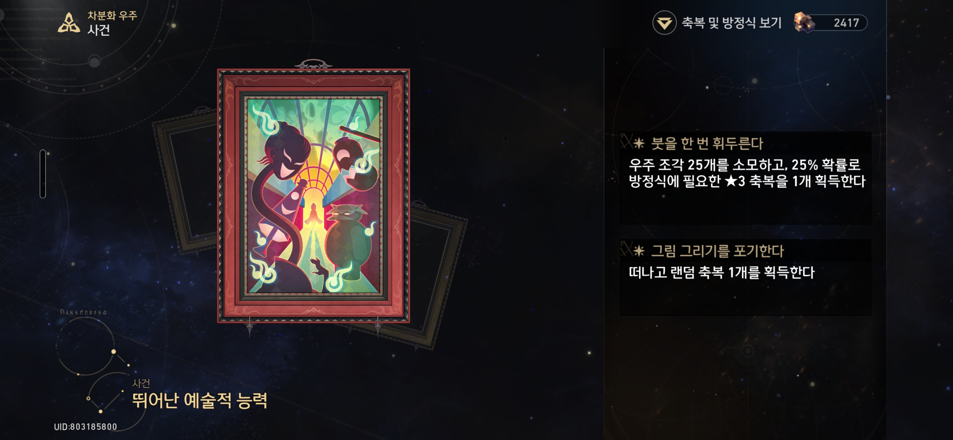 붓을 한 번 휘두른다 - 우주 조각 25개를 소모하고, 25% 확률로 방정식에 필요한 ★3 축복을 1개 획득한다